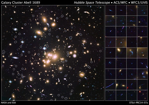 Karena proses yang dikenal sebagai pelensaan gravitasi, gugus besar ini mendistorsi ruang-waktu di sekitarnya, membelokkan dan memperbesar cahaya dari galaksi di belakangnya. Tanpa lensa, banyak galaksi yang tampak hanya sebagai titik cahaya bagi Hubble. (Gugus galaksi besar membengkokkan ruang angkasa, mengungkap apa yang ada di baliknya (video))